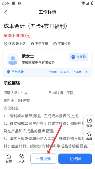 4、进入成本会计岗位的工作详情页面后,点击页面底部的“一键投递”按钮,即可完成该岗位的简历投递操作。