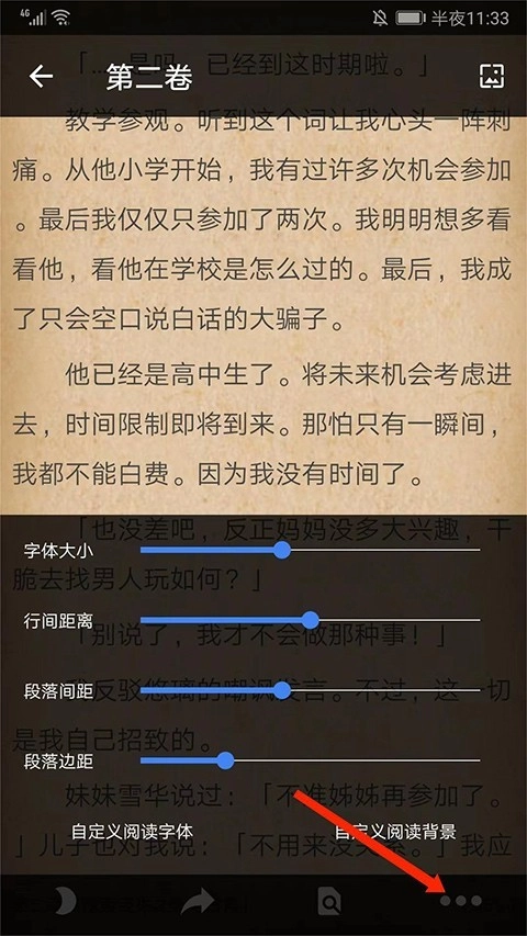 4、进入阅读界面后,点击右下角的【三个点】图标,用户就能对字体大小、行间距、段落间距、段落边距和背景进行设置。