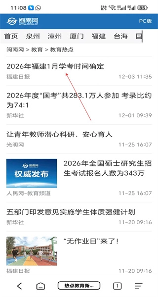 2、进入热点教育新闻页面后,浏览多条资讯标题,选定目标资讯并点击,就能进入该资讯的详细内容页面。