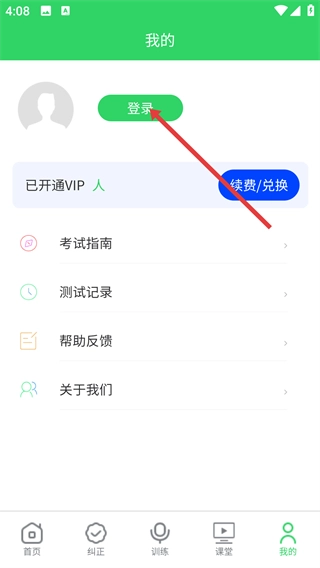 2、进入“我的”页面后,找到绿色的【登录】按钮并点击,登录成功后就能使用考试指南、测试记录等功能了。