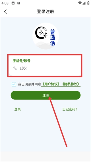 4、在登录注册页面的【号/账号】输入框填写信息,勾选相关协议后,点击绿色的【注册】按钮,即可完成账号注册流程。