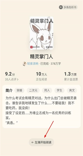 4、进入书籍详情页,查看简介与评分,点击左滑开始阅读按钮,即可进入书籍阅读界面。