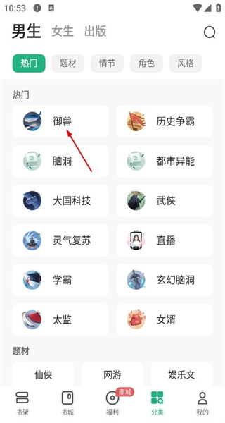1、启动软件后,进入男生分类页面,在热门题材中找到御兽选项,点击进入对应的分类页面。