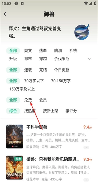 2、进入御兽分类页面,查看题材释义,能够依据热度等条件筛选书籍,浏览展示出的作品列表。
