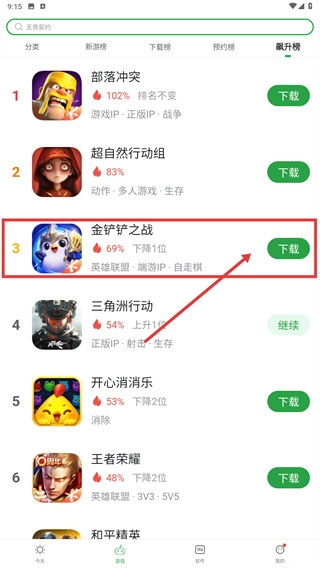 3、在飙升榜列表中,找到类似【金铲铲之战】这样的条目,点击其对应的区域,即可进入该条目的详情页面。