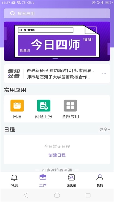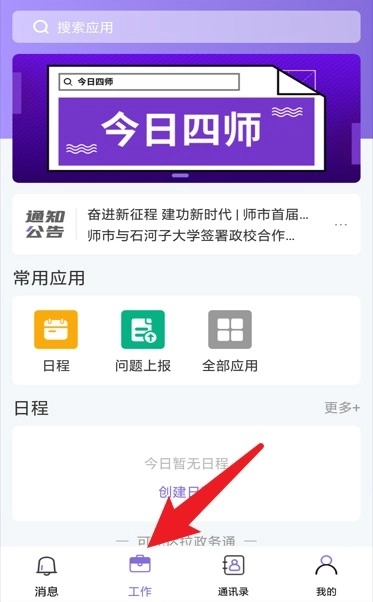 2、点击底部的“工作”选项进入应用区域,在这里可以使用日程管理、问题上报等日常办公相关功能。
