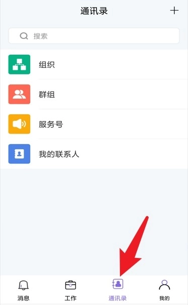 3、点击“通讯录”进入组织架构页面,能够查看群组、服务号以及个人联系人等各类通讯信息。