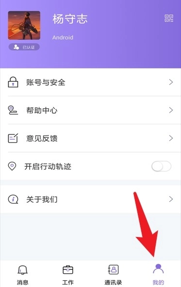 4、点击“我的”进入个人主页,在该页面中,您可以进行账号安全设置、查看帮助反馈内容以及开启行动轨迹功能。