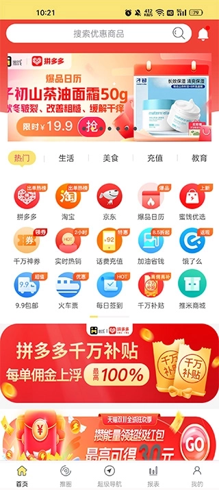 2、海量搜索:依托庞大的商品库,各类商品均可搜索,平台展示的商品均配备优惠券、隐藏券、私密券等多种券型组合,价格低至超乎想象。