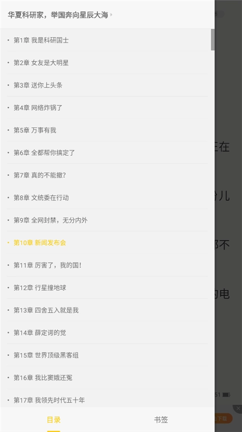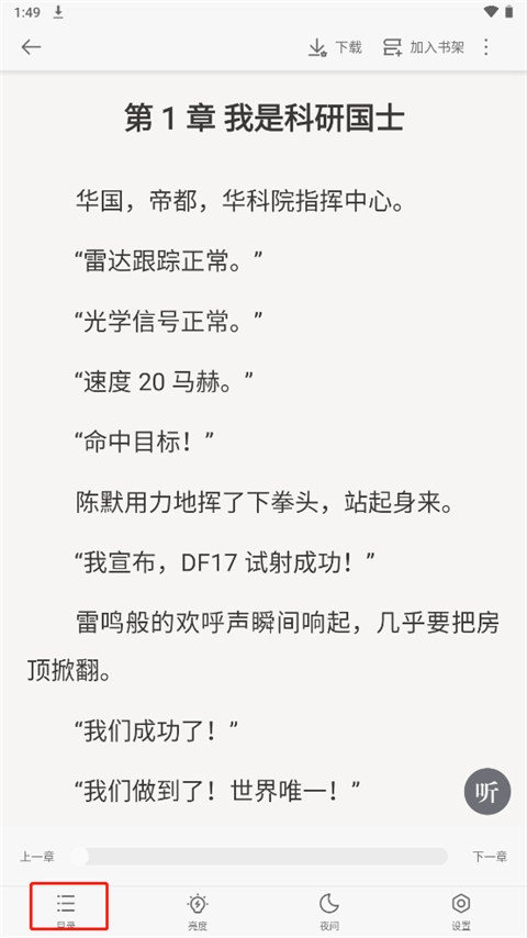 3、进入小说阅读页面后,点击屏幕中间区域,会弹出包含目录、亮度调节、夜间模式、设置等功能的操作界面,此时选择点击“目录”选项即可。