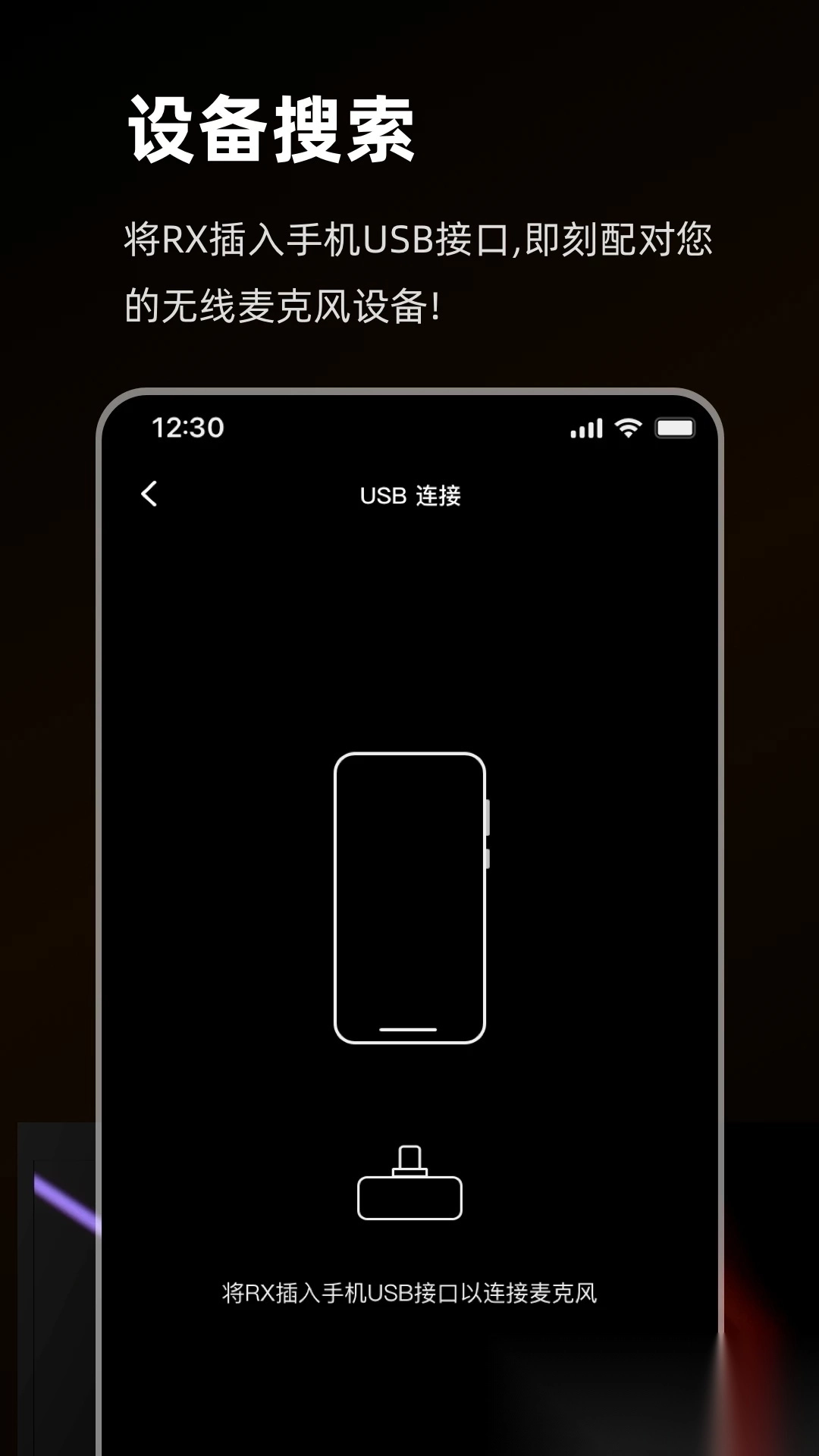 把接收器插到手机的USB接口上,就能自动搜索并完成与对应无线麦克风设备的配对。