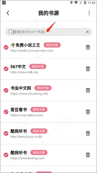 3、在书源页面里能看到总共有1000多个书源,你可以随时进行删除和调整操作。