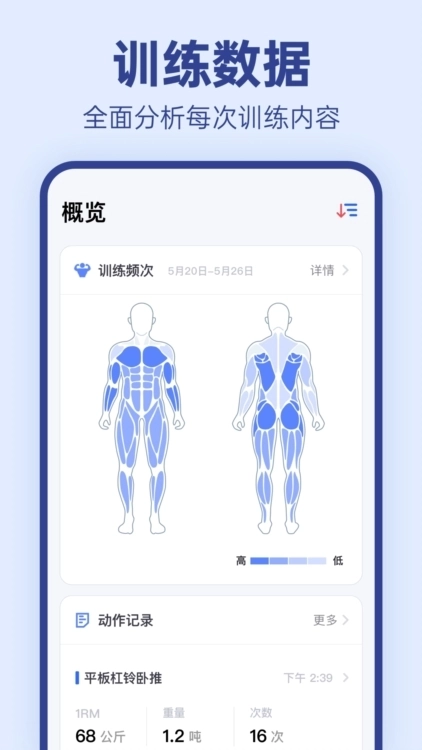 部位训练频率分析:通过统计身体各部位的训练频次,辅助优化训练计划,以预防过度训练问题和肌肉发展失衡现象。