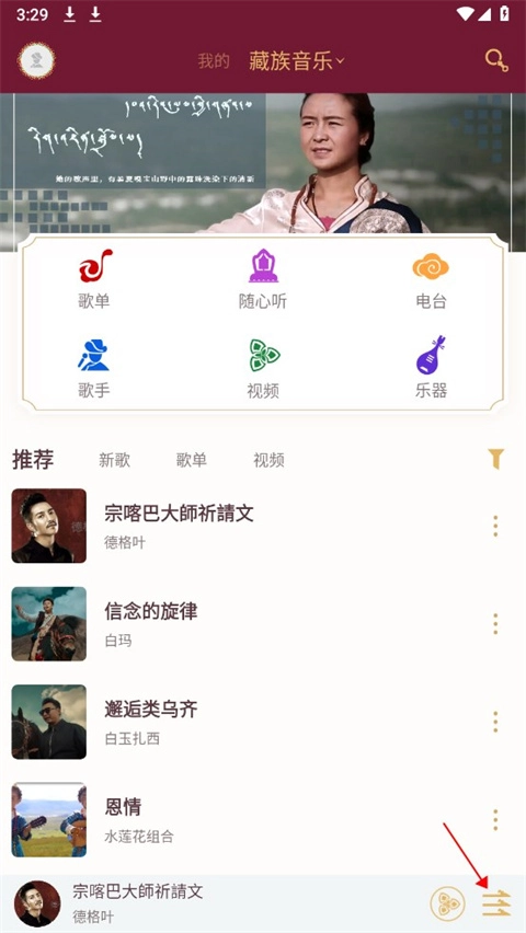 1、进入雪域音乐,点击右下角正在播放音乐的设置。