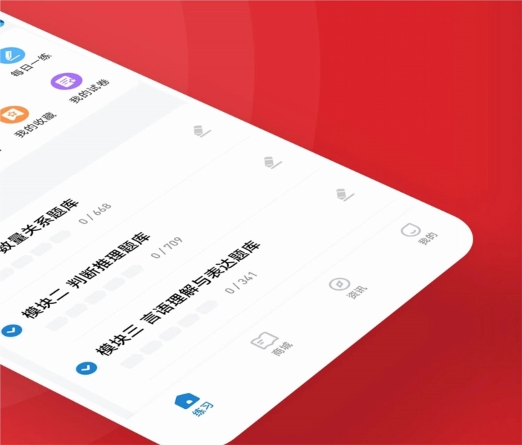 行测题库涵盖政治理论、常识判断、言语理解与表达、数量关系、判断推理、资料分析这六大模块的题目,题量充足,可满足考生在不同备考阶段的练习需要。其中,言语理解与表达模块包含逻辑填空、片段阅读、语句排序等多种具体题型。