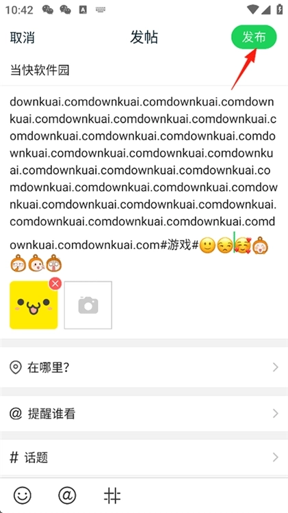 3、在输入框中填写您想要表达的内容,期间可以插入图片、添加表情、关联话题或者@其他用户,所有内容准备好后,点击页面右上角的“发布”按钮即可。
