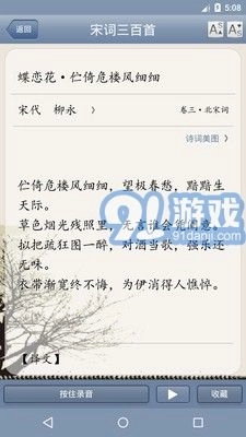 天鸿嘉汇宋词三百首是一款面向宋词爱好者的安卓学习阅读应用,收录了南北两宋知名词人的经典作品,配备详细的注释、赏析与翻译功能,助力用户在任何时间地点学习宋词,感受古代文学的独特韵味。