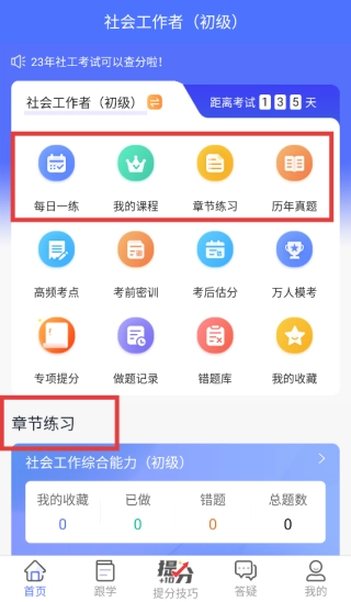 3、进入学习界面使用章节练习、真题模拟等功能