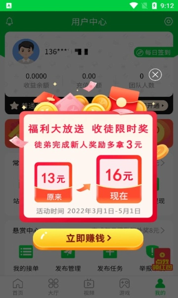 2、完成任务获取奖金:平台提供多种简单任务,完成后可立即获得现金奖励。