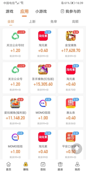 平台除了提供答题赚钱的机会外,还有不少有趣的赚钱任务,像试玩应用、邀请好友、在线打卡之类的。