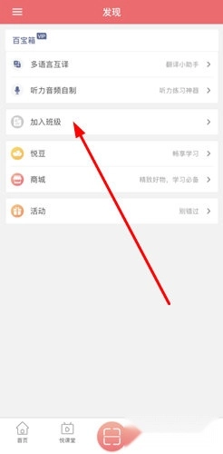 1、悦作业学生版能让广大学生更便捷地学习,小编发现不少初次使用的用户不清楚如何加入班级,想了解的话快来看看下面的教程!首先要进入“发现”栏目,点击里面的“加入班级”选项就能开始加入流程,具体操作可参考下图: