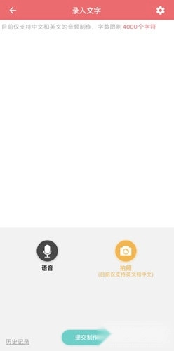 2、在顶部的文字录入区域,你可以复制粘贴中英文听力文本,也能借助语音输入或拍照识别的方式导入听力内容,字数上限为4000字。完成输入后,点击“提交制作”按钮,就能生成专属于你的听力材料,具体操作可参考下图: