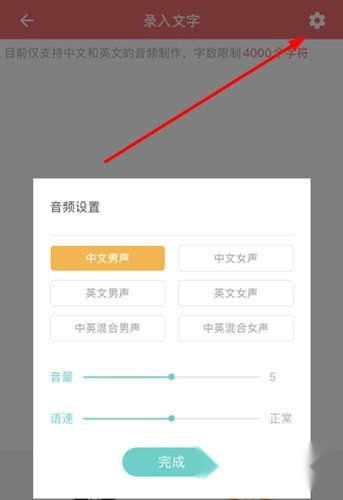 3、大家在听听力前,还可以点击音频设置选项,对听力的风格、音量和语速进行调节,具体操作可参考下图: