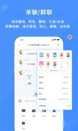 2、单聊与群聊功能:无论是消息撤回、转发还是删除,都能轻松完成各类操作;群聊管理也更便捷,成员管理、群主转让、群解散等功能一应俱全。