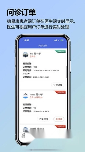 4、问诊订单:糖易康患者端提交的订单会在医生端实时同步显示,医生能够依据这些用户订单开展实时处理工作。