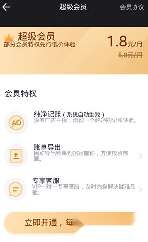 3、阅读会员特权,点击【立即开通】并完成会员费用支付,即可将账单导出至指定邮箱。