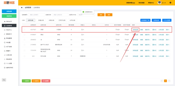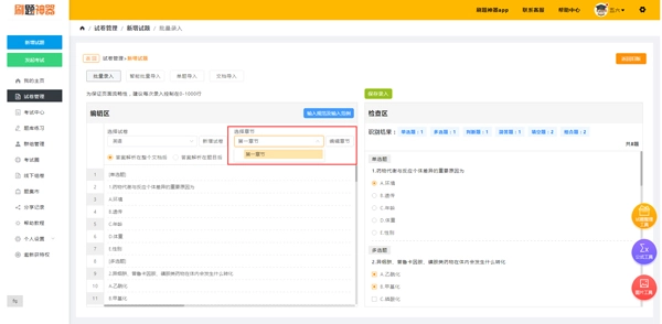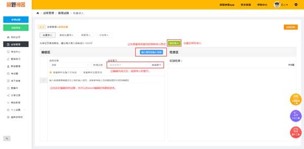 找到刚才创建的试卷,点击【新增试题】进入批量导入页面,左侧是编辑区域,右侧为试题检查区域,记得查看中间的试题范例。