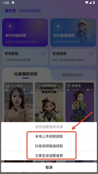 2、选择话题音频的来源,可通过本地上传视频提取、抖音视频链接提取、文案生成这几种方式获取话题音频。