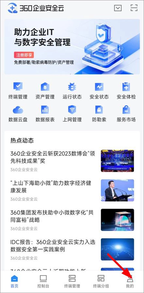 1、用户打开360企业安全云并登录进入首页,在该页面可开展终端管理、资产管理、查看运行/安全状态、进行安全体检等操作,随后点击“我的”选项。