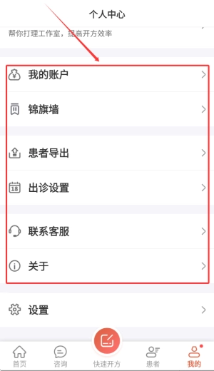 3、进入个人中心,可进行账户管理、出诊设置,还能联系客服,查看锦旗墙。