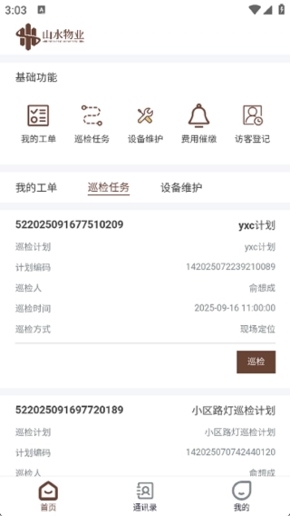 2、巡检任务等模块,清晰呈现计划编码、巡检人员、时间、方式等信息,便于物业人员开展工作。