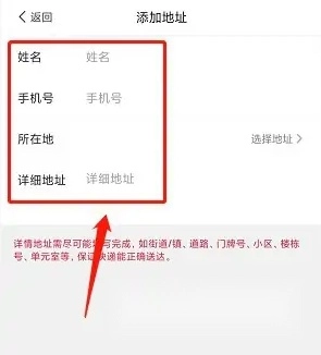 4、进入添加地址的界面,依次输入姓名、联系电话、所在地以及详细地址,然后点击【保存】按钮。