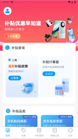 1、首页包含补贴政策、补贴计算器、数码换新、货车报废更新、汽车置换补贴等功能。