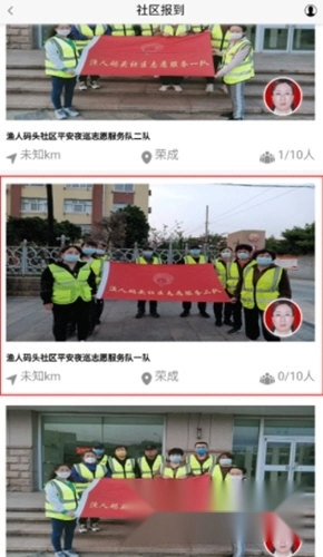 1、打开后默认进入【首页】,点击顶部的“社区报到”功能区,这里展示了众多志愿者活动与队伍,你可挑选心仪的活动并点击进入详情页。