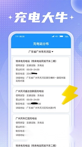 3、提供充电桩的详细地址、营业时间、联系电话等信息,用户可依据这些信息找到适合自己的充电桩。
