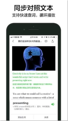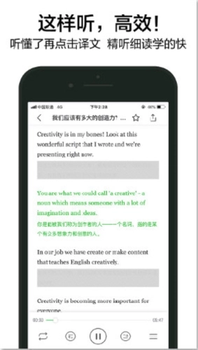4、内容针对不同英语水平的学习者,提供全英文与中英文对照两种模式,且可自由切换。