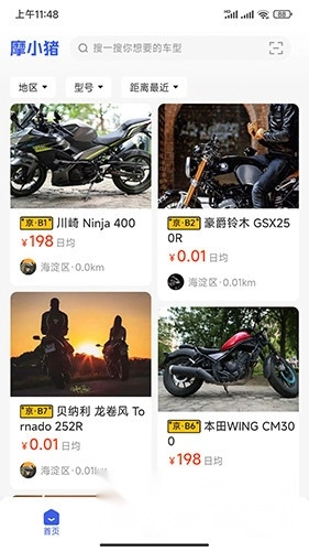 摩小猪是一款优质的摩托租赁服务软件,热爱摩托车的用户可以在平台上浏览到众多不同品牌、不同型号的摩托车,既有经典款,也有潮流款,其中部分还是车主自行优化改装的,足以让大家大饱眼福。在App里能清晰看到每辆摩托车的租赁价格,选好车型和租赁时间,与车主沟通后就能完成下单。