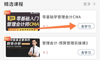 1、同样是在管理会计考试题库的主页面,找到精选课程板块,点击该课程右侧的“去学习”按钮。