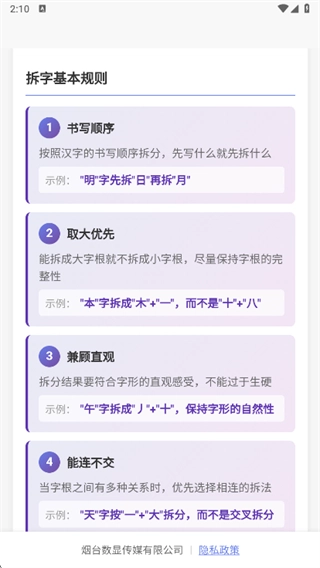 4.拆字规则库涵盖书写顺序规范、取大优先原则等核心要点,并配备动态演示功能。