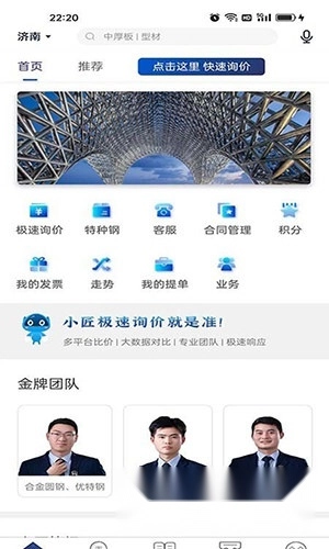 我们整合了全网钢铁交易的实时行情数据,深入剖析当前及未来政策走向对市场的影响,并结合国际国内的发展态势,致力于为您提供精准、及时的钢材报价及全方位的后续服务。平台还设有极速询价、语音搜索、钢材信息展示、业务员信息查询、积分商城等实用功能模块。