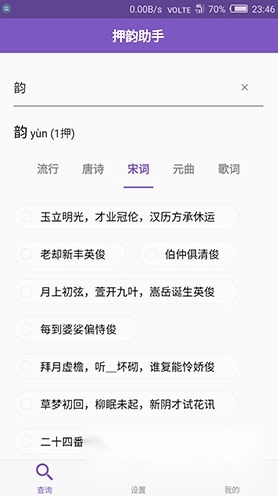 押韵助手是一款相当实用的押韵造句工具。这款软件整合了全汉字库、全唐诗、全宋词、全元曲以及百万级歌词资源,能有效助力用户提升创作效率。其词汇覆盖范围不仅包含所有汉字,还收录了数十万常用词汇,无论您需要查询何种内容,都能在这里找到对应的押韵词汇。软件的查询速度十分快捷,能够精准且迅速地呈现所需的押韵词汇,让用户的押韵查询操作变得简单高效。