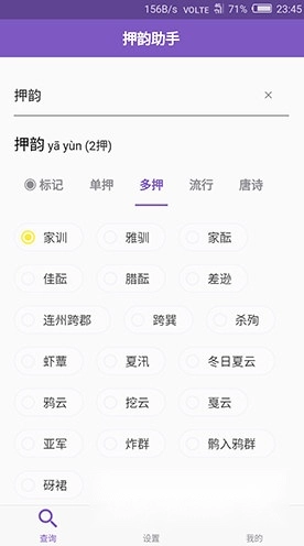 提供单押、双押等词汇的押韵查询功能,用户可根据自身需求进行对应的内容查询。