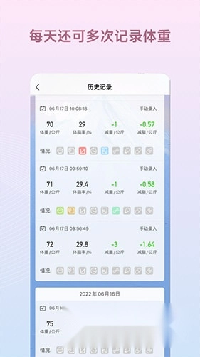 1、体重记录与打卡功能:借助减肥打卡和体重记录,对减肥过程中的相关数据进行分析,让减肥这件事变得更轻松。是你在快速减重、塑造身材、健身锻炼、调整体型时不可或缺的减肥辅助工具。