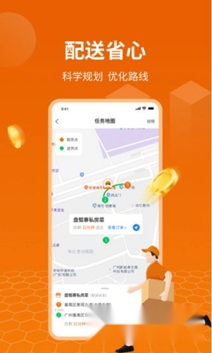 我们提供智能导航服务,能快速精准地定位,系统还会为骑手展示最迟送达地址的路线,并通过实时阅览功能,协助骑手规划最优配送路径,从而缩短配送时长。