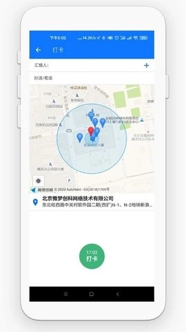 2、打卡:员工外出工作时,可通过客户端记录其在工作场所的位置与时间,以实现便捷打卡。