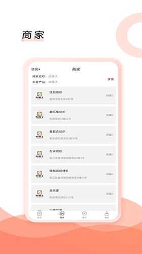 1、商家列表:商家页面汇集了提供各类布料资源的商家信息,可随意查找商家;